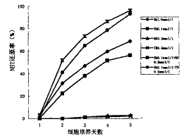 三、细胞生长、分化检测 将各诱导剂储存液稀释至所需浓度,加入培养体系达到所需的效应浓度,并预先配置BA/ATRA(2000∶1)和TB/ATRA(2000∶1)联合应用的浓度比例,混合后加入培养体系,台盼蓝拒染判断细胞存活率,离心甩片制片,镜下观察细胞形态,NBT还原率评价细胞分化,方法参照文献[1]。CD11b表达由流式细胞仪检测(Coulter公司Epics XL型),间接免疫荧光标记,单抗购自法国Immunotech公司。