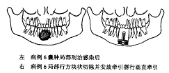 图7 治疗前及牵引完成后的曲面体层X线片上图可见左侧升支大部被肿物所占据下图可见肿物切除并守成牵引时牵引器的位置