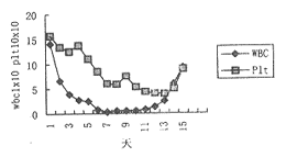 我们以干细胞回输为第1天,观察高剂量化疗后WBC、Plt中位数的变化(见图2)。病人WBC在干细胞回输第7天至最低点,中位数为0.3,持续4天,于回输第11天开始上升第14天完全正常。血小板下降晚于白细胞,在回输第10~11天至最低点,第15天开始上升。所有病人在干细胞回输2周后血象均能恢复正常,无1例发生骨髓功能障碍,16例病人高剂量化疗后局部放疗,3例手术。并在此后继续常规化疗,2例两次高剂量化疗。