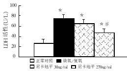尼卡地平对LDH和CK的影响 与对照组比,单纯缺氧/复氧使LDH和CK的释放显著升高(P<0.01),缺氧/复氧前预防性用尼卡地平30ng/ml并不能明显降低LDH和CK的释放,270ng/ml的尼卡地平能显著减轻缺氧/复氧引起的LDH和CK的释放,但仍明显高于正常对照组,见图1和图2。