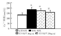 尼卡地平对心肌细胞内Ca2+的影响 正常对照组细胞内游离Ca2+为134.72mol/L,单纯缺氧/复氧使其显著升高至183.85mol/L(P<0.01);缺氧/复氧前预防性用尼卡地平270ng/ml,能显著减轻细胞内游离Ca2+升高而降至156.92ng/ml(P<0.01);30ng/ml尼卡地平对其无明显影响,见图3。