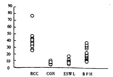 肾结石组碎石后血清TGF-β1浓度18.9±9.0ng/ml,范围9.2~33 .7ng/ml,前列腺增生组血清TGF-β1浓度7.9±2.8ng/ml,范围 4.3~16.4ng/ml,两者均高于正常组,差异均有显著性(P<0.01) 。肾细胞癌组血清TGF-β1浓度亦明显高于肾结石碎石组和前列腺组,差异均有显著 性(P<0.01),见图1。