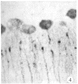 在上述脑区和核团的阳性减弱,但脊髓白质星形胶质细胞具强阳性标记,尤以突起中阳性产物明显,见图5。脊髓中央管室管膜细胞为强阳性,尤其是其突起具强烈标记,见图6,第三脑室室管膜细胞阳性标记也很强。