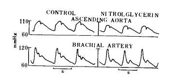 (左)为未含服硝酸甘油的波形,(右)为含服硝酸甘油的波形,硝酸甘油使主动脉压力波形明显下降,但肱动脉收缩压无改变,但它们的收缩波反射均已明显降低。