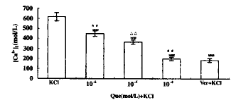 2 Que对高K+去极化引起[Ca2+]i 升高的抑制作用: 高KCl(70 mmol/L)使膜去极化作用,明显增加ASMC[Ca2+]i ,由127.90± 10.51 nmol/L增至614.91±39.04 nmol/L(n=5,P<0.01)。当预先分别加入Que 10-6、10-5、10-4mol/L,再加入KCl(70 mmol/L ),则使升高的[Ca2+]i 分别下降了27.06%,41.08%,67.95%, 呈剂量依赖性降低[Ca2+]i(P均<0.01 ); 在同样条件下,Ver(10-5mol/L)使升高的细胞内钙降低了70.09%,与同剂量的Que相 比P<0.01,具有统计学义,见Fig 1。