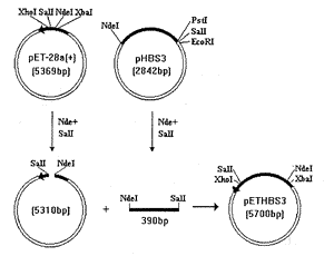 2.3 SHBsAg3表达质粒的构建 以NdeI-SalI双酶切含SHBsAg3编码区的重组质粒pHBS3 DNA,回收390bp的目的DNA,与同样双酶切的pET-28a(+)载体片段相连接,获得重组表达质粒pEHBS3,见图2。经XbaI-XhoI双酶切证明连接正确(图从略)。