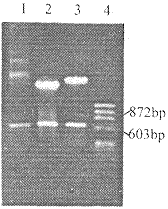 The PCR product obtained from the cDNA library of bovine macrophages is sho wn in lane 1.The digested pUR3 and pSR3 with EcoRI and HindⅢ are respectively mi grated in lane 2 and lane 3.The marker φ x174 DNA-HaeⅢ is in lane 4.kdy, 百拇医药