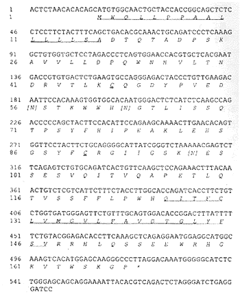 The signal peptide sequence was underlined. The cysteine residues were double-underlined and the transmembrane region was underlined with wave line. The asparagine residues in parentheses indicated the potential N-linked gloycosylation sites. The stop codon was marked with asterisk.
