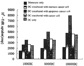 1.2.6 负载抗原后DCs的免疫活性:4组DCs(受凋亡胆管癌细胞刺激、坏死胆 管癌细胞刺激、正常培养的胆管癌细胞及自体T淋巴细胞的刺激)用IMDM培养基悬浮, 浓度为5×105/ml,分别以1×103/孔,5×103/孔,1×104 /孔加入96孔圆底培养板,用单核细胞作对照组,每组各3个复孔,每孔再加入同种T细 胞1×105,终体积为200μl,37°C、5% CO2及饱和湿度的条件下 培养96h, 于培养前18h加H3-TdR,0.5μCi/孔。收集细胞,液闪计数检测cpm值 ,结果用3孔平均值表示。