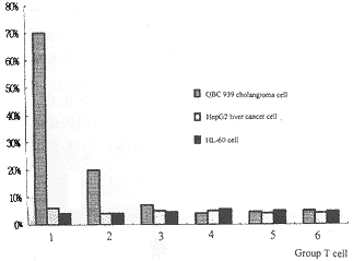 2.3 CTLs杀伤活性试验(MTT法) (1)组T细胞是来自 DCs+T淋巴细胞和凋亡胆管癌细胞共培养组。在细胞杀伤试验3种靶细胞中能特异性地 识别并杀伤胆管癌细胞,其杀伤能力与效应细胞数量成正比,故说明DCs通过凋亡胆管癌细胞 获取胆管癌细胞抗原刺激T淋巴细胞产生特异性CTLs。(2)组T淋巴细胞是来自DC s+T淋巴细胞和胆管癌细胞共培养组。由于在细胞杀伤试验中,仅能有限地杀伤胆管癌细 胞,说明DCs不能有效地从培养的胆管癌细胞中获取抗原,从而有效刺激T淋巴细胞产生 特异性CTLs。(3)组T细胞是来自DCs+T淋巴细胞和坏死胆管癌细胞共培养组。 在细胞杀伤试验中,不能特异性地杀伤胆管癌细胞,故说明DCs不能从坏死胆管癌细胞中 获取抗原。(4)组T细胞是来自DCs+T淋巴细胞无肿瘤细胞共培养组。DCs如果无 抗原呈递增的对象,其本身是不能刺激T细胞产生特异性CTLs的,故在细胞杀 伤试验中 识别及杀伤3种靶细胞的效率极低。(5)组T细胞是来自T淋巴细胞+凋亡胆管癌细胞无 DCs共培养组。在无DCs条件下,仅有T细胞和凋亡胆管癌细胞,缺乏DCs抗原提呈 并刺激T细胞产生特异性CTLs,故在细胞杀伤试验中T细胞不具有杀伤肿瘤细胞的能力 。(6)组T细胞是来自外周血分离出的T细胞作对照组。由于缺乏DCs 抗原提呈和刺激作用,在细胞杀伤试验中T细胞不具有特异性杀伤肿瘤细胞的能力(见图5 ~图7)。