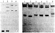 Fig 1 The efficiency of ssDNA formation under conditions of denaturing samples with LIS buffer Lane 1:543bp dsDNA control; DNA samples containing the 543bp DNA fragment were denatured at 98℃ for 5 minutes with formamide loading buffer (lane 2) or with LIS loading buffer (lanes 3,4). Electrophoresis was run on 8% gel at 15℃ in 0.5×TBE for 3 hours. Fig 2 PCR-LIS-SSCP analysis of the 543bp fragments bearing the point mutations causing α-thalassemias Lane l:Wild type control; lanes 2-6: The three SSCP profiles can be detected on the gel; Confirmed by DNA sequencing analysis, the DNAs represented these profiles have turned out to be the different three mutants, i.e., the αQS mutation(lane 2), the αCS mutation(lanes 3-5) and the αWestmead mutation(lane 6), respectively (data not shown). Electrophoresis was run under the same conditions as described above (see the legend in Fig 1)