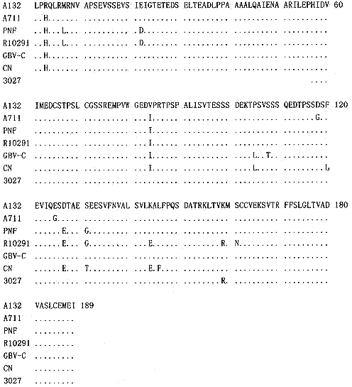 Fig.2 Comparison of deduced amino acid sequence of HGV A132 NS5 with the corresponding sequences from 3027, A711 strains and CN, PNF2161,R10291,GBV-C isolates