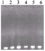 1.2.4 RT-PCR RT反应 反应体积10μL,其中dNTP 2μL,AMV酶2U,AMV缓冲液2μL,随机引物1μL,RNA样品4μL。室温(28℃)放置10min,42℃水浴30min,95℃5min,后迅速放入-20℃冻存。PCR循环反应和1%琼脂糖电泳同上。