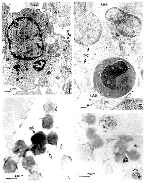 Fig.5 Dendritic cell contacting with LAK and HPBALL cells tightly.The cytotoxity particles(Δ)of LAK transmitting to tumor cells and HPBALL cells (