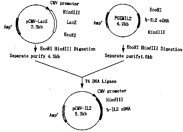 用pCMV-LacZ质粒(美国Wisconsin大学Waisman中心惠赠),经限制性内切酶HindⅢ、EcoR Ⅰ(华美生物工程公司)双酶切,去掉3.0kb的LacZ基因,回收含CMV启动子的4.3kb片段;pGEM-3zf(+)-IL2经相同双酶切处理,提取其中1.0kb的h-IL2cDNA片段,与含有CMV启动子的DNA片段经T4连接酶连接,建成pCMV-IL2真核载体(图2)。
