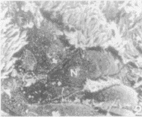Fig.4 Luminal surface of esophagus of the newborn. Non-ciliated cells (N) clustered around one ciliated cell. ×3 000