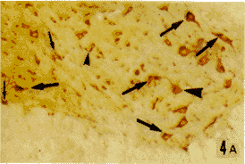 Fig.2 A mGluR1 and ER double immunohistochemical staining section of the reticular formation of upper medulla oblongata.B:IL-2 immunohistochemical staining serial neighbor section of A., The targets pointed by different arrows and triangles are the same as in Fig.1. ×100