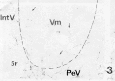 Fig.3 Sparse SPR-LI fibers and weakly stained SPR-like neurons (arrows) in the trigeminal motor nucleus (Vm). 5r: motor root of trigeminal nerve; IntV:intertrigeminal nucleus; PeV:peritrigeminal zone.