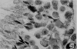 Fig. 2 Immunohisiochemical location of the MSH27 aniigen in testes (APAAP meihod) ( 10×40).2a ,negative control;2b ,lmmuno-location by mAb MSH27