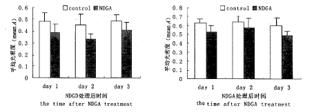 Fig.1 The changes of VEGF(Left) and bFGF(Right) expression after NDGA treatment.