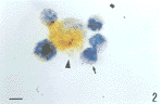 Fig.1 Wright staining of fresh isolated cells. Note large cell with irregular nucleus(↑).Bar=20μm