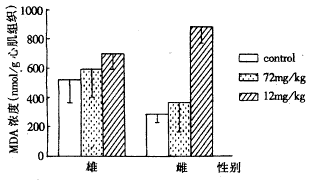 2.2 心、肝、肾及血清MDA含量 对心肌细胞高剂量组雌雄大鼠均有不同程度的增高,但无统计学意义。高剂量组除雄性的肝脏和雌性的肾脏稍有降低(但无统计学意义)外,其余均有不同程度的增高。低剂量组与对照组比雌雄大鼠除心脏增高外其余均降低,且均有统计学意义,见表1、图1、2、3、4。