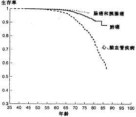 按死因类型分层,拟合Cox比例危险度的简单模型(没有包括其他协变量)。图1显示三种死因类型的生存曲线,表明55岁以前,三种疾病的死亡危险度均是很小的,曲线间互相交叉和重叠。50岁以后,生存率开始下降,以心、脑血管疾病最为明显。类型别死亡危险度是否随生存时期呈平滑的趋势(即按比例升高或下降),是通过将类型层变量拟造为时间协变量来检验的。如果包括所有年龄,比例危险度的假设检验统计量P值为临界水平(似然比=3.76,自由度为1,P=0.052)。如果排除小于50岁的生存年龄,显示约2%死因别危险度随生存年龄稍有上升,但比例危险度假设成立(似然比=1.95,自由度为1,P=0.163)。