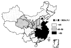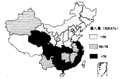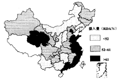 我国东北的黑龙江,东南的福建、广东、江西、广西、海南的摄入量较低,都在80%RDA以下。摄入较高的省份为新疆、内蒙、河南、山西、河北、安徽,都在100%RDA以上。硫胺素摄入较低的地区比较集中,提示与该地区的生活习惯有很大的关系。硫胺素摄入较低的省份,猪肉及动物内脏摄入量都较低,低于全国平均值。