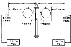 1.3 脉冲噪声测量 鉴于动物试验地面发射持续时间变化范围很小,在 人体验证试验中只测 量峰值声压级(dB,re:20 μPa)。测量采用B.K.4135型电容传声器、B.K.AO0029型30 m电缆 和 B.K.2209型脉冲精密声级计,符合国军标要求。测试前用B.K.4230型声级校准器对整个测量 系统进行校准。现场测试时用峰值保持档直读峰值声压级。电容传感器固定在三角架上,其 高度与受试者耳朵等高,距受试者外耳道口25 cm,膜片朝向弹体。受试者站位与噪声测量布 点见示意图(图1)。