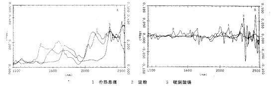 扑热息痛、淀粉和硬脂酸镁的近红外漫反射光谱(常规光谱)和一阶导数光谱分别见图1中A和B所示。对于一阶导数光谱,不同△λ时,一阶导数光谱的信噪比有所改变。实验表明,当△λ为10nm时,其信噪比最好,因此一阶导数光谱数据都是在△λ为10nm时测得的。