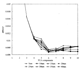 按5、10、15、20、25、30、35和40nm的波长间隔采集光谱数据,分别在44个校正集样品情况下,组成数据矩阵。使用交互校验法(Cross-Validation)[1],计算预测的均方根误差RMSEP。即在某一主成分下,44个校正集样品中的43个样品用做建立数学校正模型,用其对剩下的一个样品中扑热息痛的含量进行定量预测。此过程一直重复到所有的校正集样品都分别被预测过,计算RMSEP。图2显示了在常规光谱法中,波长间隔,主成分数对RMSEP的影响。从图2看出,当波长间隔为20nm、主成分数为6时,其RMSEP=0.00666,为最小。而在一阶导数光谱法中,波长间隔为5nm、主成分数为3时,其RMSEP=0.00825,为最小(图略)。