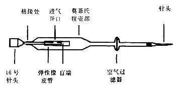 取16号注射针头1个,将尖端锋利部分去掉,封闭该端管口使之呈盲端,于距该端1~1.5 cm处开 一进 气口并套上弹性橡皮管,从而使进气口形成一活瓣,只能进气不能出气。用一次性塑料输液器莫菲氏腹壶部的上端与针梗的根部相粘接;壶的另一端接20 cm长输液管,中间安装空气过滤器;末端接针头。见附图。