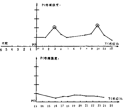 疼痛记录单以坐标图表示(见附图)。横轴为时间(用T表示),左侧为术前时间,右侧为术后时间。纵轴为疼痛强度(用P表示),至下而上依次分为5个阶段,即Po(无痛)、P轻(轻度痛)、P中(中度痛)、P强(强烈痛)、P最(最强痛)。