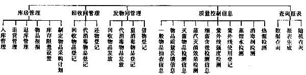 本系统对物品供应过程中的进、耗、存、用及质量检测信息进行全方位的采集,包括库房物品管理、回收间管理、发物间管理、质控信息管理、查询与报表五个功能模块,见附图。
