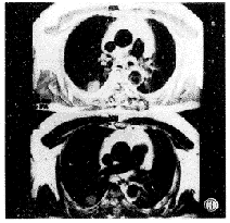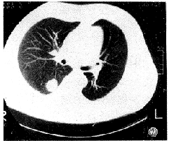 放射学实践990231 男性患者,50岁。因咳嗽3周伴脓痰1周入院。咳嗽呈阵发性,伴大量脓痰,并有胸痛、气喘、胸闷等。在当地医院抗炎无好转,脓痰转为白粘痰。入院体检及心电图、B超、肺功能检查均无异常。胸片见右肺门区一圆形高密度影(图1)。CT见病灶位于右下叶背段,大小约2cm×2cm,密度均匀,边缘光滑锐利、似有分叶,肺窗见单支血管供血(图2)。MRI见肿块呈等T1、等T2信号,肺门、纵隔未见肿大淋巴结(图3)。诊断:右下叶背段肿瘤性病变。