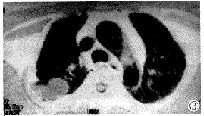 胸部平片 右上肺第一、二前肋间腋侧见不规则的块影,侧位位于上后胸壁,大小约为3cm×5cm,边缘光整,局部胸膜广泛增厚,肋骨增生明显,右上胸廓稍塌陷(图1),余肺心膈未见异常。诊断: 右后上胸壁结核。