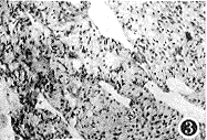 图3 图2放大,HE×400。 讨论 血管母细胞瘤临床上较少见,多发生于中年男性,而且多见生长在小脑半球或蚓部,发生在脊髓部的则少见。肿瘤多为单发,但也可多发。少数病人甚至还可同时并发其他部位肿瘤,由于这类肿瘤常与脑膜相连,故常被称为“血管母细胞脑膜瘤(Angioblastic meningoma)。”
