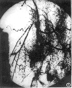 图1 治疗前胫骨上端骨肉瘤病变,造影显示肿瘤血管丰富,肿瘤染色明显 图2 同图1病例。经一次介入治疗后肿瘤明显缩小,造影显示肿瘤血管基本消失,证实肿瘤坏死率可达90%以上