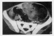 临床放射学杂志000724 患者 女,5岁。腹痛伴包块2个月。2个月前患儿出现不明原因腹痛,呈阵发性绞痛,自感左下腹部有坠胀感来院就诊。体检:左侧下腹部扪及12cm×11cm×8cm大小包块,质较硬,有压痛,可活动。B超探及左中下腹内有上述大小之混合性团块,边界欠清,子宫右后推移,考虑畸胎瘤。钡剂灌肠,在乙状结肠和降结肠区域有肠外压迫改变。