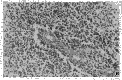 3cm,性质与大者相同,但与周围组织无粘连,小肠系膜上有数个直径约1.0cm大小的淋巴结。切除肿块2个,取部分淋巴结送病检。肉眼见:瘤质韧实,切面为灰白色鱼肉状,有出血、坏死,囊液为淡黄色胶冻状约200ml。镜下:瘤组织内血管丰富,大小形态不一,核仁大,有异型,核分裂像较多,瘤细胞间有散在淋巴细胞浸润(图2)。病理报告:盆腔血管外皮肉瘤、淋巴结内有肉瘤转移。术后化疗3个月CT复查,见盆腔内又长出9cm×7cm×6cm大小不规则囊实性肿块,盆壁周围有淋巴结肿大。