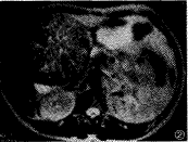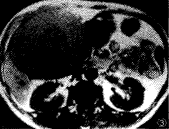 MRI扫描示: 肝右叶一13.5cm×12.0cm巨大的团块,呈稍长T1、T2信号,信号不均,其内可见短或长T1、T2信号,边界光整,周边可见低信号带(图2、3)。
