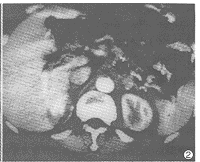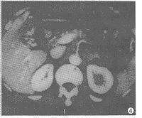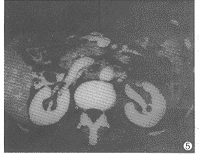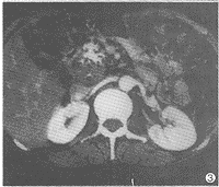 10例胰腺实质内有散在钙化,多较粗大。11例实质内散在小囊性病灶。8例Wirsung管受压变窄,其远端胰管不规则扩张,直径平均5mm。7例胆总管胰头部受压变窄,狭窄段呈移行性、光滑,狭窄近端胆管扩张,其中2例直径大于16mm,其余为8~10mm,平均9.5mm。双管同时扩张7例。治疗1年后随访,扩张之胆总管均缩至7mm以下。9例炎症过程累及胰腺周围,尤其是下腔静脉、腹主动脉及其分支腹腔动脉干等血管间隙,7例表现为斑点、条索、片状失脂肪密度。2例腹腔动脉干,肠系膜上动、静脉受累,血管被包绕,管壁增厚,管腔狭窄(图4)。12例腹腔动脉干直径均小于6mm,肠系膜上动脉直径平均小于7mm,肠系膜上静脉直径均小于12mm,平均11mm,肠系膜上动、静脉的比值均小于1。2例腹膜后淋巴结肿大,直径15~20mm(图5)。