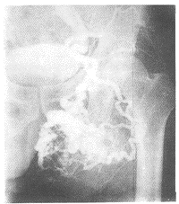 1.2 造影表现:以Seldinger方法经右股动脉插管,先用猪尾巴导管作两侧髂动脉造影,明确肿块系左髂内动脉供血后,再换Cobra导管作左髂内动脉造影,表现为左侧动脉血管包括左髂总、髂内及髂外均明显扩张,以髂内扩张迂曲最明显,动脉早期髂内动脉分支瘤样扩张团状扭曲,后期出现血池样和蚓状曲张血管,血流时间明显加快,可见粗大回流静脉,瘤区血管团最大直径达16 cm(见附图)。诊断为左臀部巨大蔓状血管瘤。