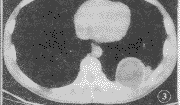 图1,2 胸部后前位及左侧位片,左下肺野见椭圆形肿块,心缘遮盖征阴性;侧位片示肿块与脊柱重迭 图3 肿块自后胸壁突向肺叶,边缘清晰,密度均匀,呈水样密度, http://www.100md.com