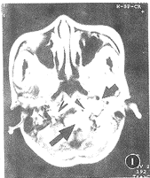 2.4 后颅窝受侵3例。在左、右桥小脑角池形成肿块各1例(图1)。在桥脑前池形成肿块1例。