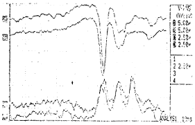 颅顶电极瘘管刺激前庭诱发电位由3~4个正波为主要成份组成,电位稳定,清晰,分别为P1、P2、P3和P4,振幅为数微伏至十几微伏之间潜伏期分别为1.7 ms,2.7 ms,3.4 ms和4.3 ms,P4有时缺失。而面神经管电极前庭诱发电位主要由一个波峰向下的大振幅主波构成(如果将参考电极和地极位置互换,则波峰向上),为与颅顶法P1波区别,称之为P波。它的潜伏期与P1波相等,见图1,其振幅在十几至几十微伏之间。ECochG主要由AP波构成,偶可见SP波,见图2。P波、P1波和AP波的振幅(A)、潜伏期(L)和波宽(W)见附表。采用直线相关两两比较的方法,发现面神经管电极前庭诱发电位的P波潜伏期和波宽分别与颅顶法P1波的潜伏期和波宽相关,前者相关系数γ=1.0000,为完全相关,后者相关系数γ=0.8367(双侧γ0.05=0.811)。其余各组的两两比较均未发现相关。