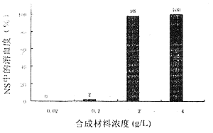 2.1.2 不同浓度合成材料对兔血细胞溶血性试验比较:按文献[6]方法进行试验,取4支相同试管,各加1ml兔全血,分别加不同浓度合成材料溶液0.1ml,各加生理盐水至10ml,置37℃水浴1h后,以3000r/min离心5min,取上清液于 414.4nm 测吸收度A,并与阳性溶血管进行比较,测得溶血度。溶血度(%)=A待测/A阳对×100%。结果见图2。