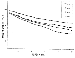 2.2.2 Ca2+对不同脂质体稳定性的影响:分别取普通脂质体、含合成材料0.2、0.6、1.8g/L的LCL快速加入1mol/L Ca2+溶液中,于450nm处测定吸收度的变化,吸收度变化率与时间的关系见图3。图示曲线表明,合成材料对外界条件的改变响应不明显。