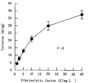 ①纤溶因子对人纤维蛋白具有溶解作用,溶解面积随着纤溶因子浓度的增加而增大(图1)。尿 激酶作阳性对照。②纤溶因子分解酪蛋白产生酪氨酸,它的产生随着反应体系中纤溶因子浓度的增高而增加(图2),表明纤溶因子确实具有纤溶酶样作用。相反,尿激酶不能分解酪蛋白。