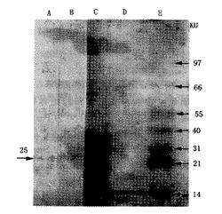 为了证实抗体对纤溶因子特异性反应,而与其它蛋白无交叉反应,采用Western印迹,实验表明该2株细胞抗体能特异地与尖吻蝮蛇蛇毒中相对分子量25 ku的纤溶因子特异性结合。而与其它带没有反应。